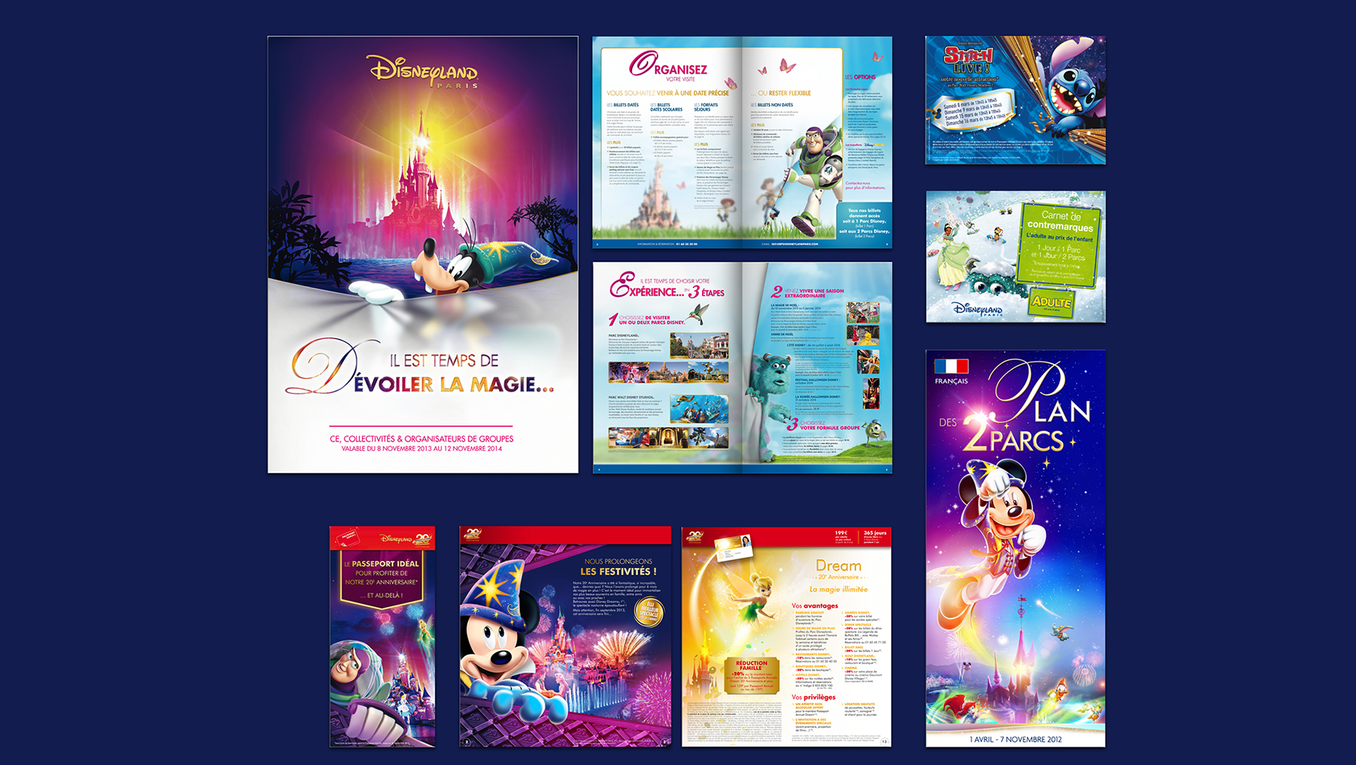 Création de tous supports de communication pour les deux parcs parisiens, Disneyland et Disney studio : flyer, menu, dossier de presse, plan des parcs, plv ...